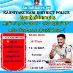 கன்னியாகுமரி மாவட்ட காவல் கண்காணிப்பாளர் டாக்டர் ஸ்டாலின் அவர்களின் வெற்றிப்பாதை பயிற்சி மையத்தின்இரண்டாம் நிலை காவலர் தேர்வுக்கான மாநில அளவிலான இலவச மாதிரி தேர்வு வரும் ஞாயிற்றுக்கிழமை 19–10–2025 அன்று […]
