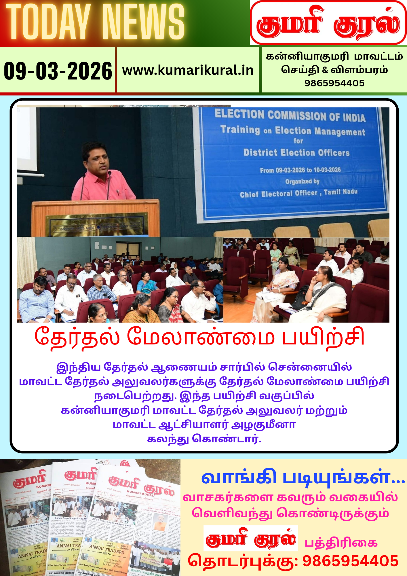 இந்திய அஞ்சல் துறை சார்பாக கன்னியாகுமரி மாவட்ட அளவிலான மக்கள் குறைதீர்க்கும் கூட்டம் 13/9/2023 அன்று காலை 11 மணி அளவில் அஞ்சல் கோட்ட முதுநிலை கண்காணிப்பாளர் அலுவலகம் தலைமை அஞ்சலக கட்டிடம் இரண்டாவது மாடி நாகர்கோவிலில் வைத்து நடைபெற உள்ளது. அஞ்சல் துறை சேவையில் ஏதேனும் குறைகள் இருப்பின் பொதுமக்கள் அதனை இக்கூட்டத்தில் நேரில் வந்து தெரிவிக்கலாம் அல்லது தங்கள் குறைகளை தபால் மூலமாக அனைத்து விவரங்கள் மற்றும் ஆவணங்களுடன் கீழ்கண்ட முகவரிக்கு அனுப்பலாம். தபால் உரையின் மீது முன் பக்க மேல் பகுதியில் தபால் சேவை குறை தீர்க்கும் முகாம் செப்டம்பர் 2023 என்று தெளிவாக குறிப்பிட்டு இருக்க வேண்டும் புகார் மனுக்கள் வந்து சேர வேண்டிய கடைசி நாள் 11.9.2023 என்று அஞ்சலக கோட்ட முதுநிலை கண்காணிப்பாளர் செந்தில்குமார் தெரிவித்துள்ளார்.