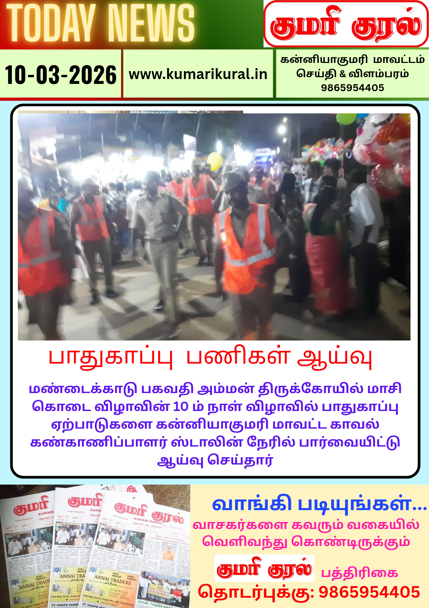 இந்திய அஞ்சல் துறை சார்பாக கன்னியாகுமரி மாவட்ட அளவிலான மக்கள் குறை தீர்க்கும் கூட்டம் 11.12.2023 அன்று காலை 11 மணியளவில் கோட்ட அஞ்சலக கண்காணிப்பாளர் அலுவலகத்தில் வைத்து நடைபெற உள்ளது. அஞ்சல்துறை சேவையில் ஏதேனும் குறைகள் இருப்பின் பொதுமக்கள் அதனை இந்த கூட்டத்தில் நேரில் வந்து தெரிவிக்கலாம் அல்லது தங்கள் குறைகளை தபால் மூலமாக அனைத்து விவரங்கள் மற்றும் ஆவணங்களுடன் கீழ்கண்ட முகவரிக்கு அனுப்பலாம். தபால் உறையின் மீது முன்பக்க மேல்பகுதியில் தபால் சேவை குறை தீர்க்கும் முகாம் டிசம்பர் 2023 என்று தெளிவாக குறிப்பிட்டிருக்க வேண்டும். புகார் மனுக்கள் வந்து சேரவேண்டிய கடைசி நாள் 8.12.2023 ஆகும். அனுப்ப வேண்டிய முகவரி