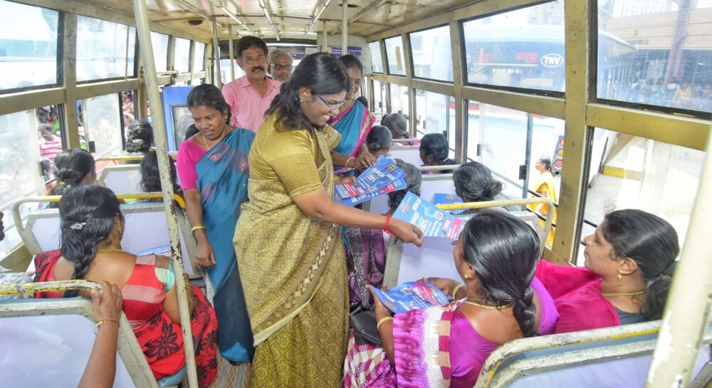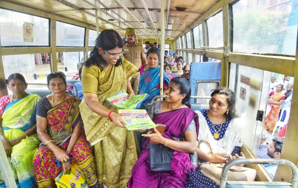 பேருந்துகளில் பயணம் செய்யும் பயணிகளுக்கு தேர்தல் விழிப்புணர்வு துண்டு பிரசுரங்கள் வழங்கப்பட்டது. இவ்வாறு மாவட்ட தேர்தல் அலுவலர் மற்றும் மாவட்ட ஆட்சியாளர் அழகுமீனா தெரிவித்தார்.