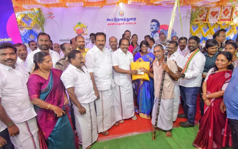 அதனடிப்படையில் தமிழ்நாடு முதலமைச்சர் சென்னை ஆலந்தூர் பகுதியில் இருந்து காணொலி காட்சி வாயிலாக துவக்கி வைத்தைத்தொடர்ந்து, கன்னியாகுமரி மாவட்ட கூட்டுறவுத்துறையின் கட்டுப்பாட்டில் உள்ள 121 கூட்டுறவு நிறுவனங்களின் கீழ் செயல்படும் 581 நியாய விலைக்கடைகள், தமிழ்நாடு நுகர்பொருள் வாணிப கழகத்தின் கீழ் செயல்படும் 135 நியாய விலைக்கடைகள், மீனவர் மற்றும் இதர கூட்டுறவின் கீழ் செயல்படும் 46 நியாய விலைக்கடைகள், சுயஉதவிக்குழுவால் நடத்தப்படும் 3 நியாய விலைக்கடைகள் என மொத்தம் 765 நியாய விலைக்கடைகளில் இணைக்கப்பட்டு உள்ள 5,79,667 அரிசி குடும்ப அட்டைதாரர்கள் மற்றும் 406 இலங்கை தமிழர் மறுவாழ்வு முகாம்களில் வசிக்கும் குடும்ப அட்டைதாரர்கள் சேர்த்து 580073 அரிசி குடும்ப அட்டைதாரர்களுக்கு 8.1.2026 முதல் பொங்கலுக்கு முன்தினம் வரை வழங்கப்படும்.
