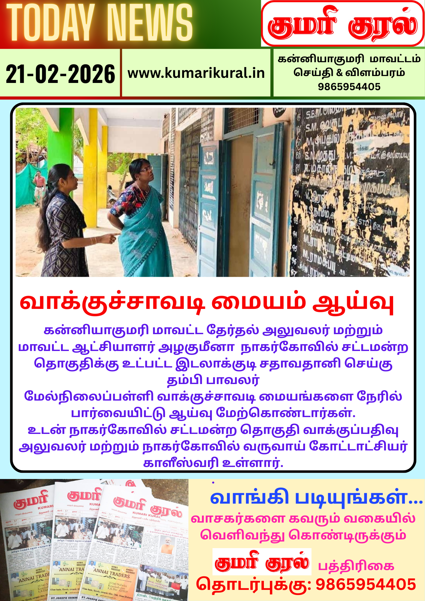 கன்னியாகுமரி மாவட்ட நிர்வாகம், வருவாய் மற்றும் பேரிடர் மேலாண்மை துறை,ஊரக வளர்ச்சி முகமை, நாகர்கோவில் மாநகராட்சி, பேரூராட்சிகள் உள்ளிட்ட துறைகளின்சார்பில் மாவட்ட ஆட்சியர் அலுவலக வளாகத்தில், மிக்ஜாம் புயலினால்பாதிக்கப்பட்டவர்களுக்கு உதவும் […]