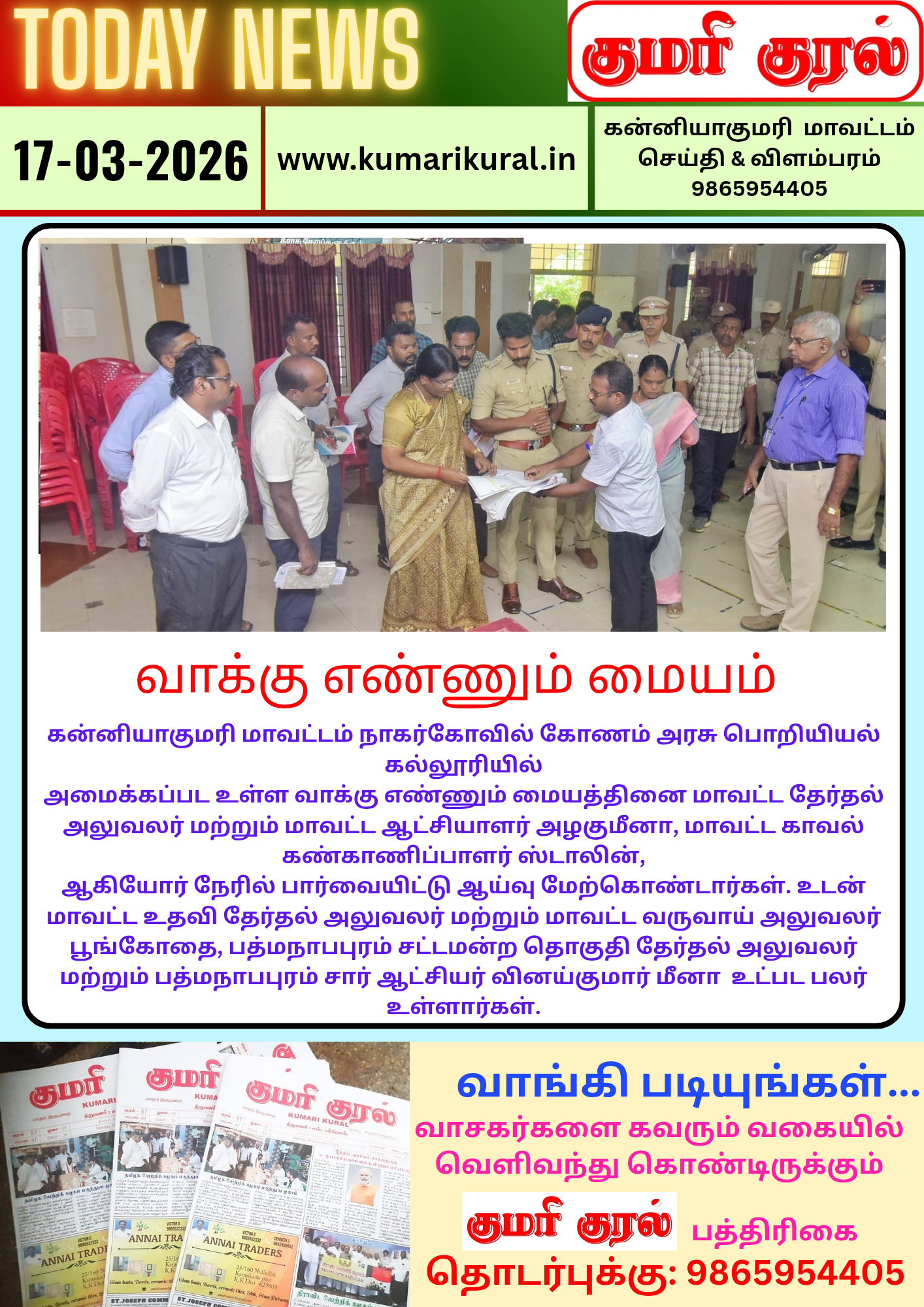 குப்பையில்லா குமரி மக்கள் இயக்கமாக மாற்றுவோம் – மீண்டும் மஞ்சப்பை விழிப்புணர்வு மாவட்ட ஆட்சியாளர் ஸ்ரீதர துவக்கி வைத்தார்.கன்னியாகுமரி மாவட்டம் சுசீந்திரம் அருள்மிகு தாணுமாலயசுவாமி கோயில் நுழைவாயில் பகுதியில் மாவட்ட […]