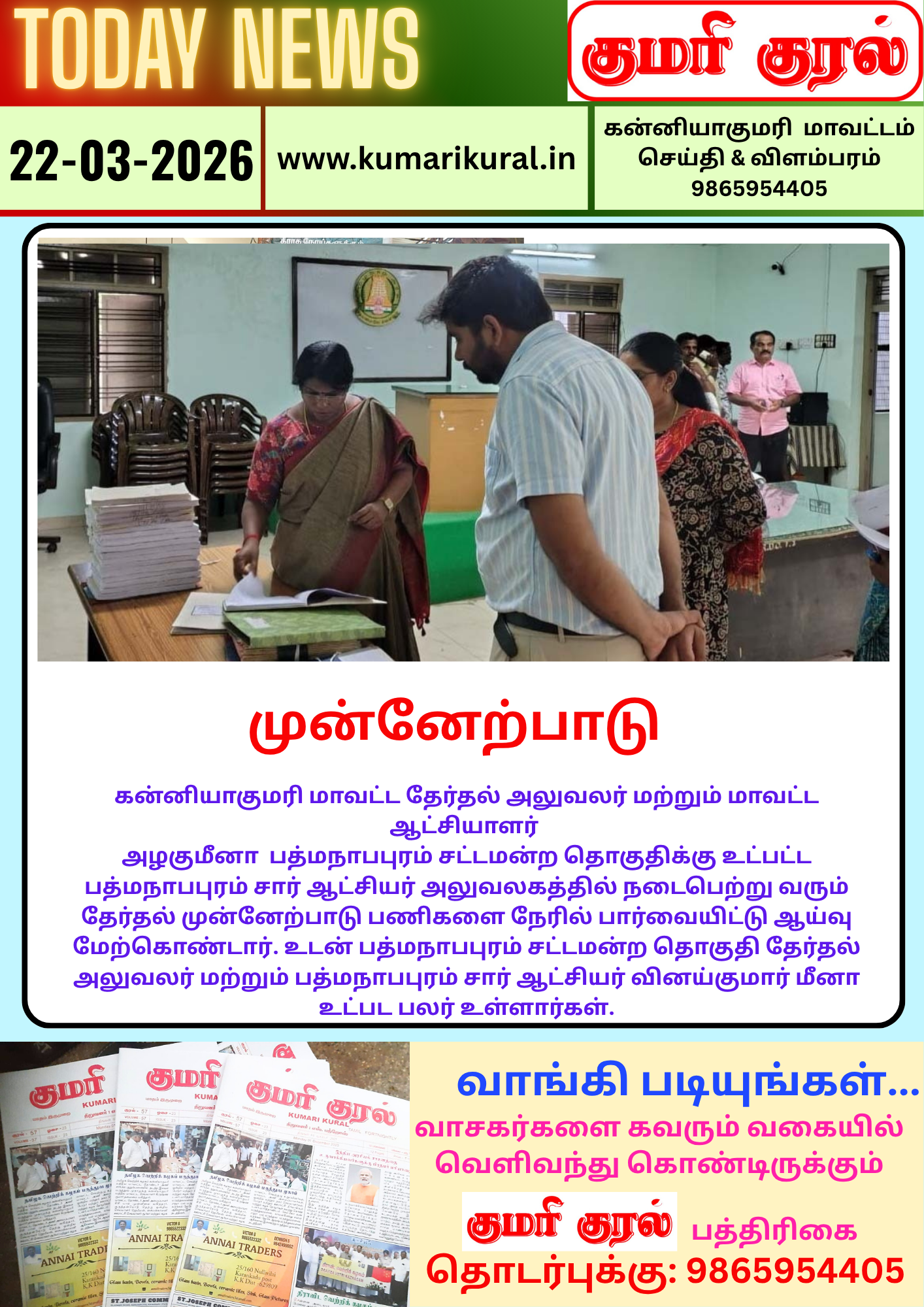 குப்பையில்லா குமரி மக்கள் இயக்கமாக மாற்றுவோம் – மீண்டும் மஞ்சப்பை விழிப்புணர்வு மாவட்ட ஆட்சியாளர் ஸ்ரீதர துவக்கி வைத்தார்.கன்னியாகுமரி மாவட்டம் சுசீந்திரம் அருள்மிகு தாணுமாலயசுவாமி கோயில் நுழைவாயில் பகுதியில் மாவட்ட […]