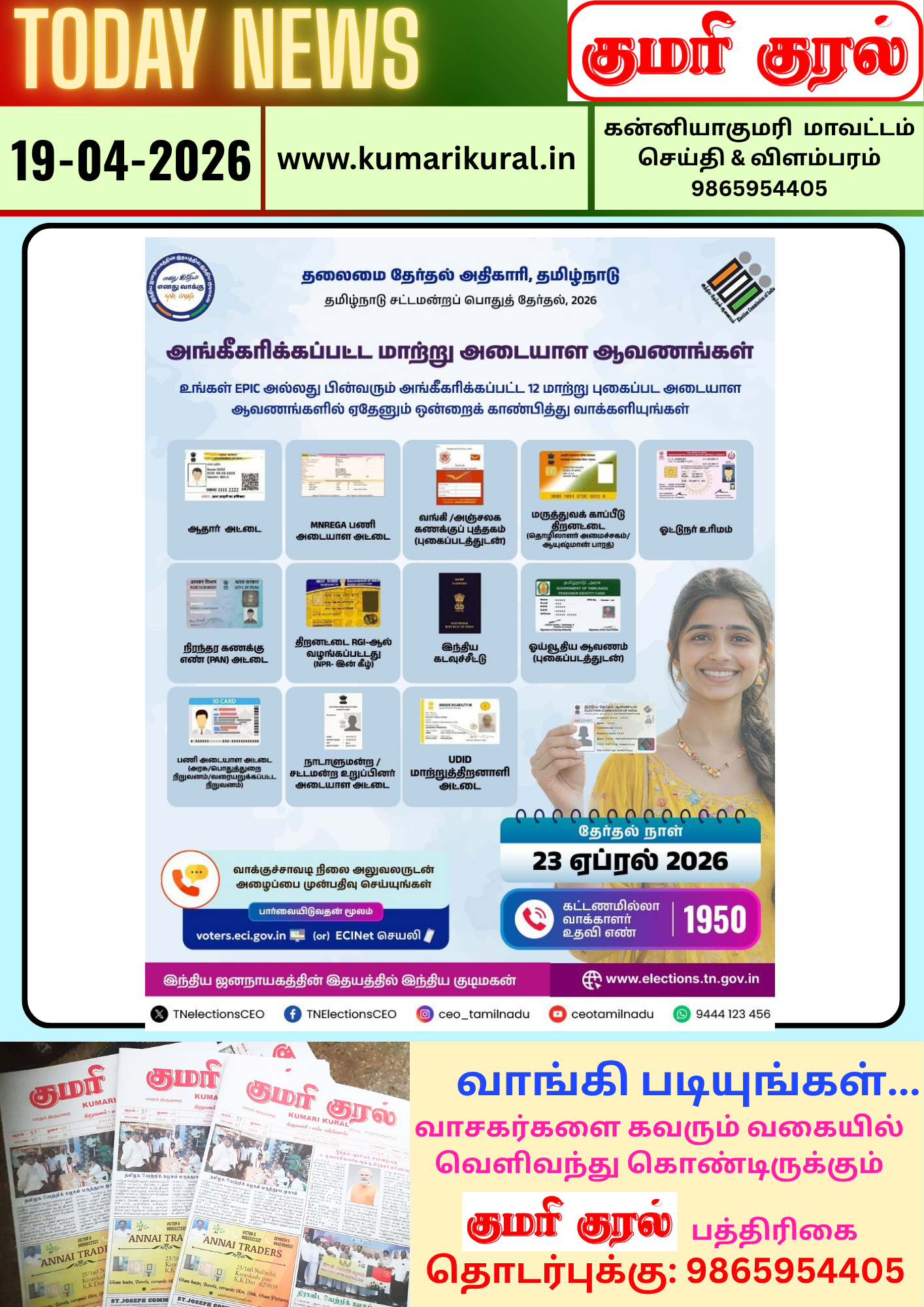 கன்னியாகுமரி மாவட்ட தேர்தல் அலுவலர் மற்றும் மாவட்ட ஆட்சியாளர் அழகுமீனா தனது செய்திக்குறிப்பில் தெரிவித்து உள்ளதாவது –இந்திய தேர்தல் ஆணையத்தால் தமிழ்நாடு சட்டமன்ற பொதுத்தேர்தல் வரும் 23.4.2026 அன்று நடைபெற […]